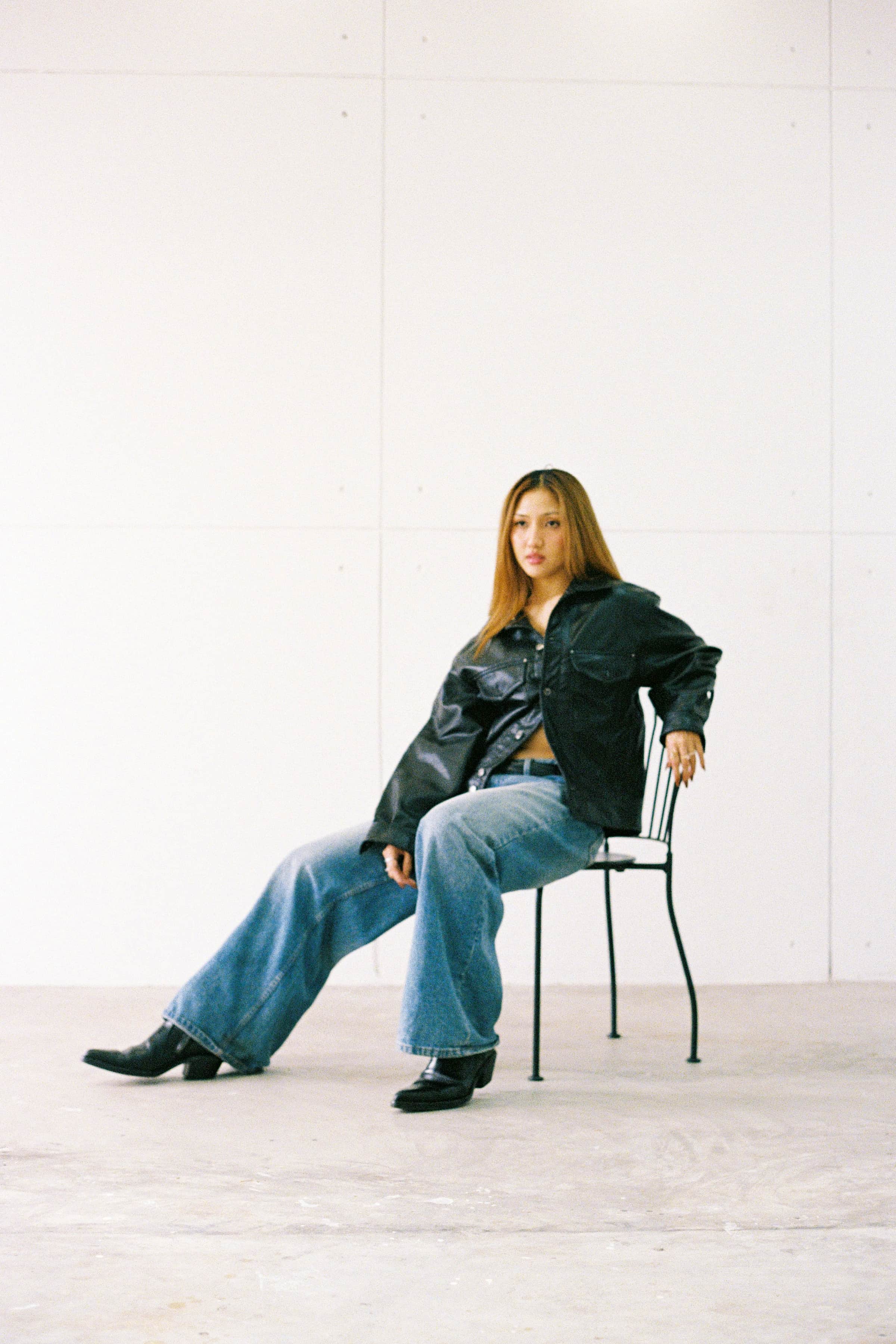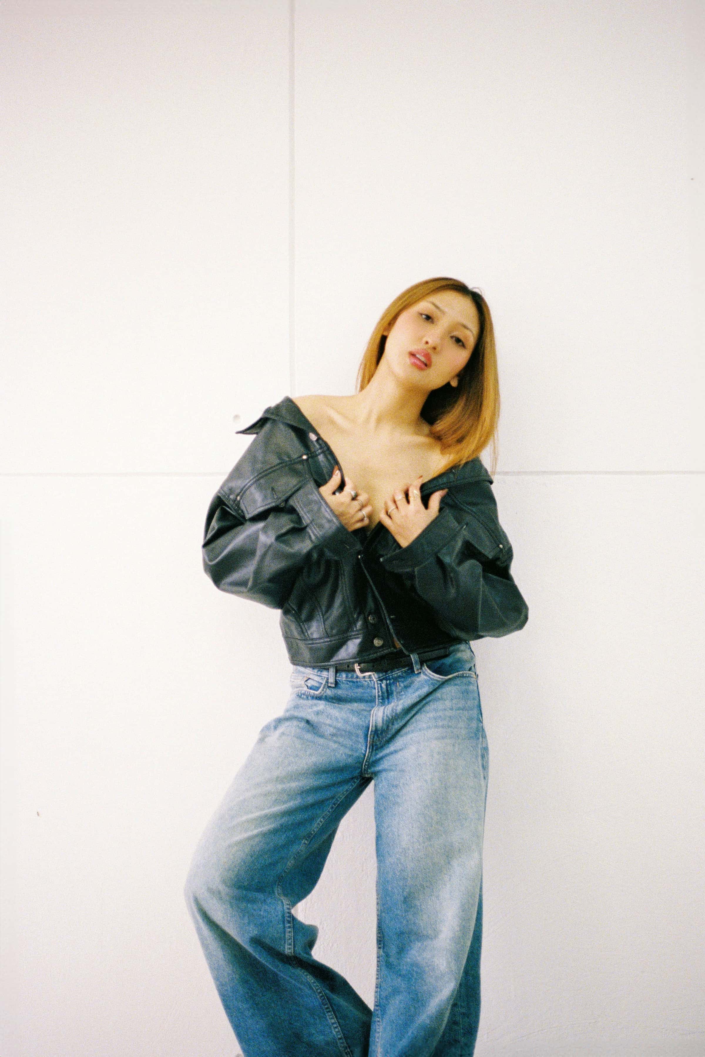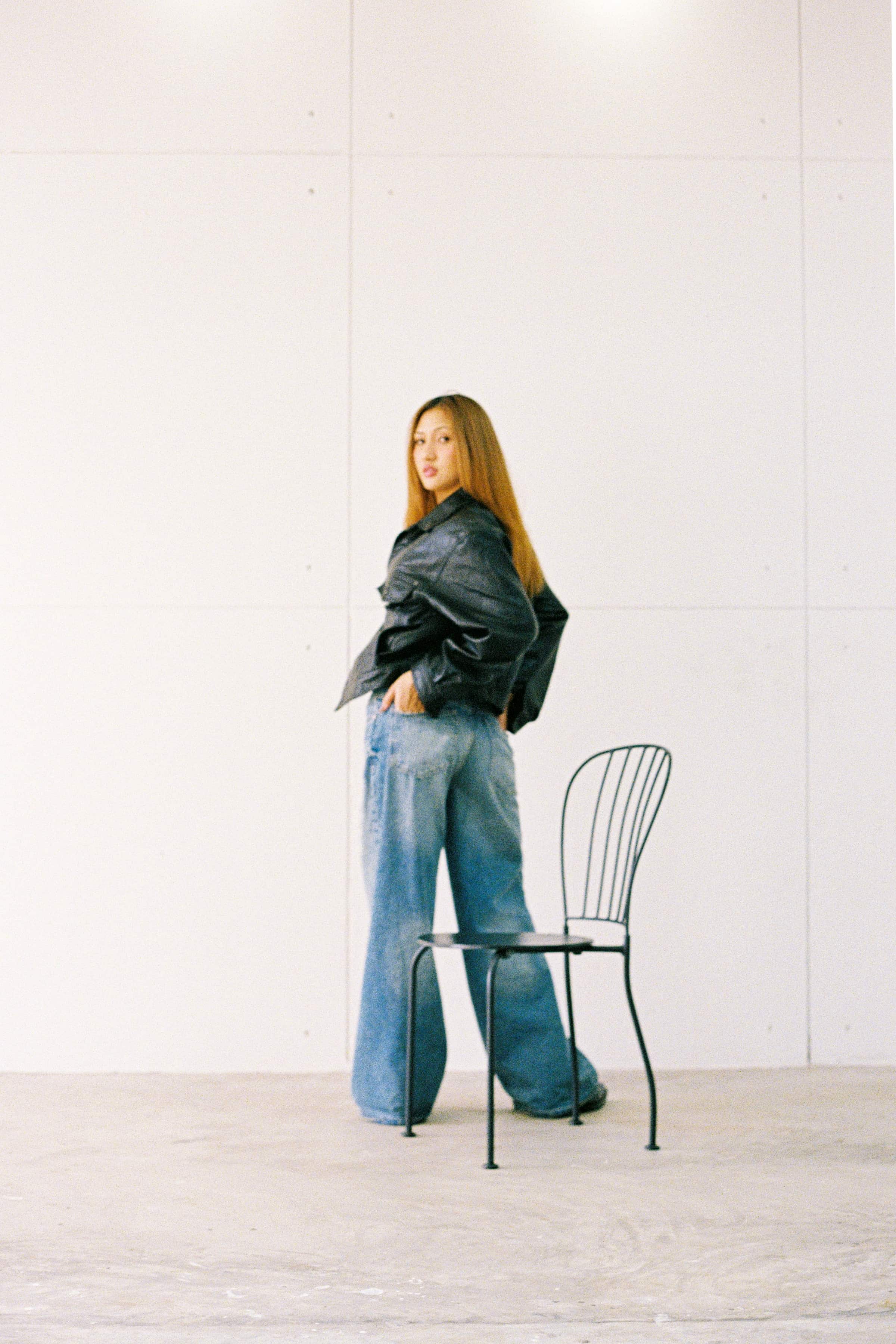 A clean, modern portrait serie of the model M Seng Lu, captured through natural light, relaxed poses, and a timeless mix of leather and denim.
